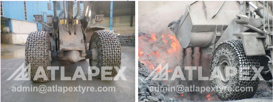 Tire protection Chain can be used in front of wheel loader, A tire protection chain (TPC) is a tight and flexible metal mesh covering the tread and sidewalls of the tire to form a barrier against tire damages through punctures, cut and excessive abrasion by sharp-edged rocks and other objects.